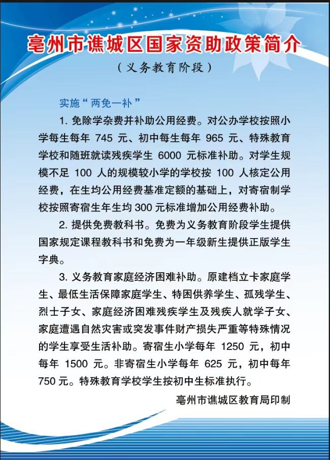 【转载上级】谯城区统一城乡义务教育“两免一补”政策