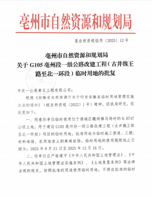 亳自然资规临用【2025】12号临时用地批复