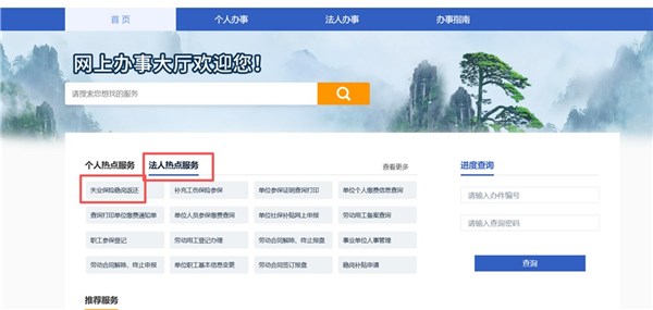 第一步:进入安徽省人社统一公共服务平台点击法人热点服务和失业保险稳岗返还。