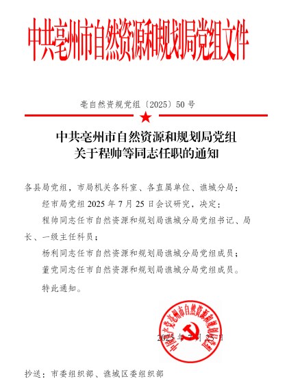 中共亳州市自然资源和规划局党组关于程帅等同志任职的通知