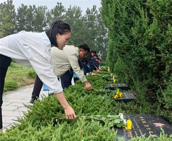 活动中,党员干部们分组走向园区内的一座座烈士墓碑,细致而专注地擦拭墓碑上的尘土。擦拭完毕,全体党员列队向长眠于此的英烈们敬献鲜花。一朵朵盛放的菊花,寄托着后人对先烈无尽的怀念与哀思。