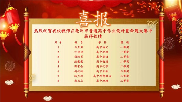 | 名称: | 亳州二中在亳州市普通高中作业设计暨命题大赛和亳州市第一届高考试题优质课竞赛中取得佳绩 |