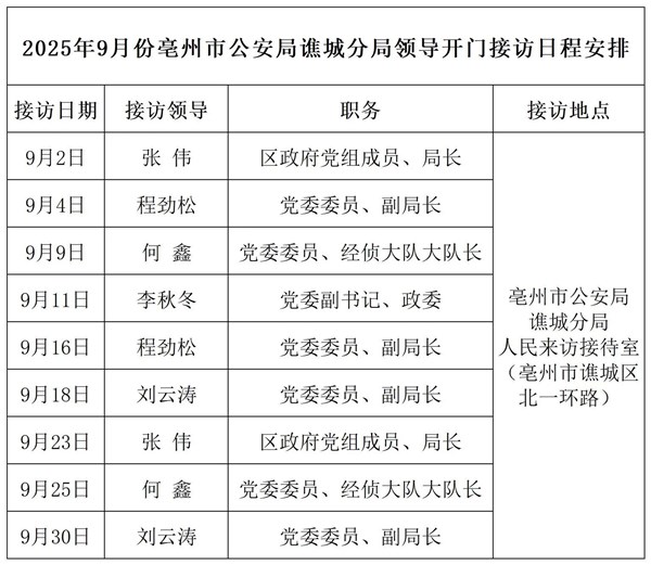 名称: | 亳州市公安局谯城分局领导干部公开接访公示 | 文号: | 无 |