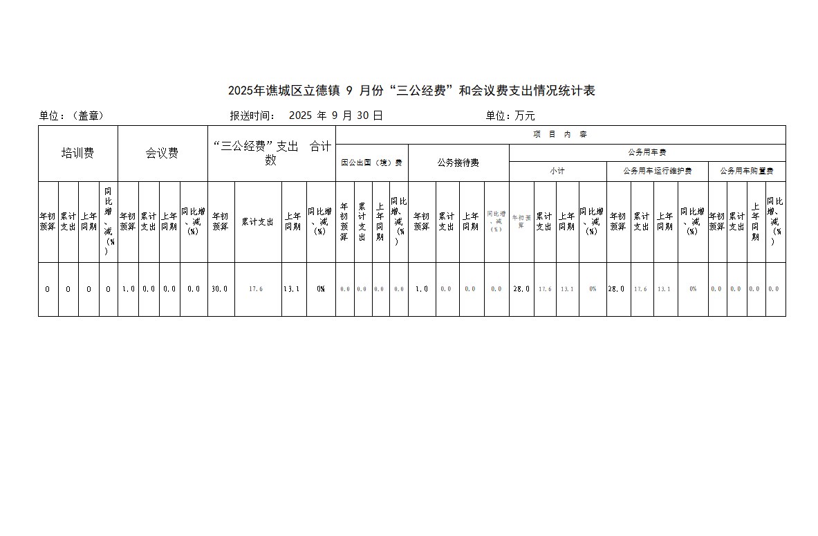 | 名称: | 2025年谯城区立德镇9月份“三公经费”和会议费支出情况统计表 |
