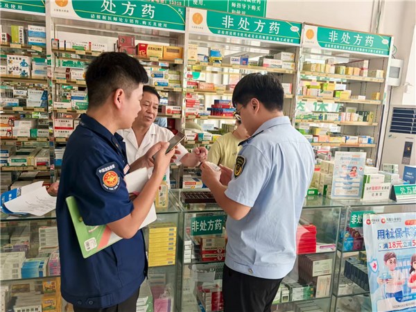 2025年6月20日上午,为贯彻落实区委区政府工作要求,进一步强化药品安全监管,维护人民群众身体健康和生命安全,开展了活动主题为“筑牢药品安全防线,守护公众健康生命线”我镇市场所联合应急办对辛集街上的药店进行了药品专项检查,同时也对前来购药的群众普及了用药安全相关事宜。