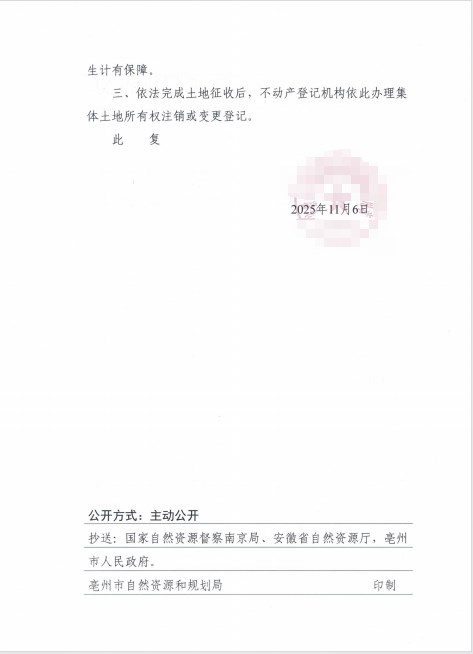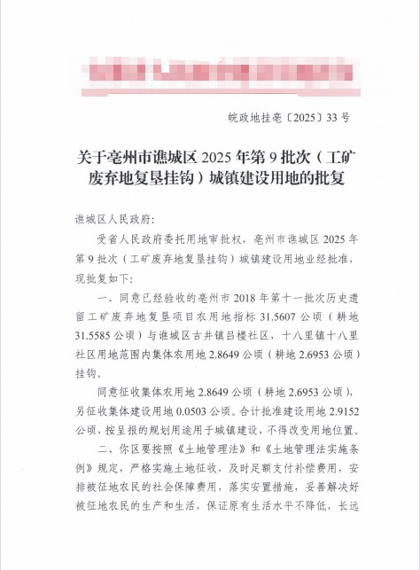 关于亳州市谯城区2025年第9批次(工矿废弃地复垦挂钩)城镇建设用地的批复
