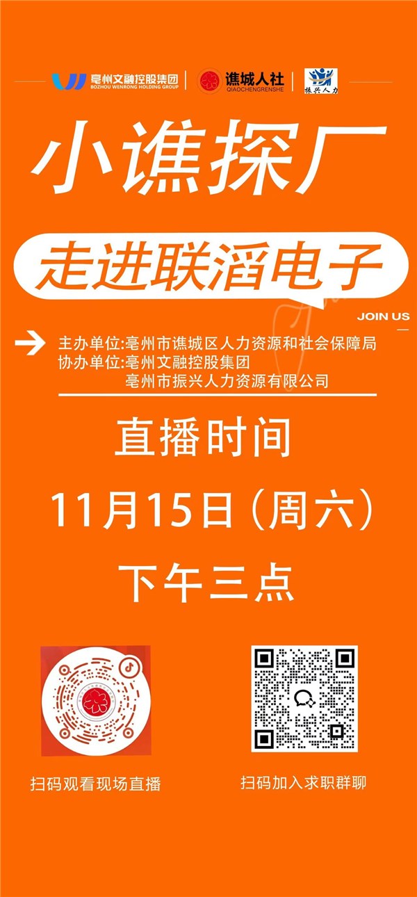 📅 今天(周六)下午3点,锁定“谯城就业”直播间! ✅ 直播内容:走进联滔电子,优质岗位一键投递,名企HR在线互动 💡 咨询热线: 联滔电子:18256789629 求职联系:0558—5353861 0558—5335566
