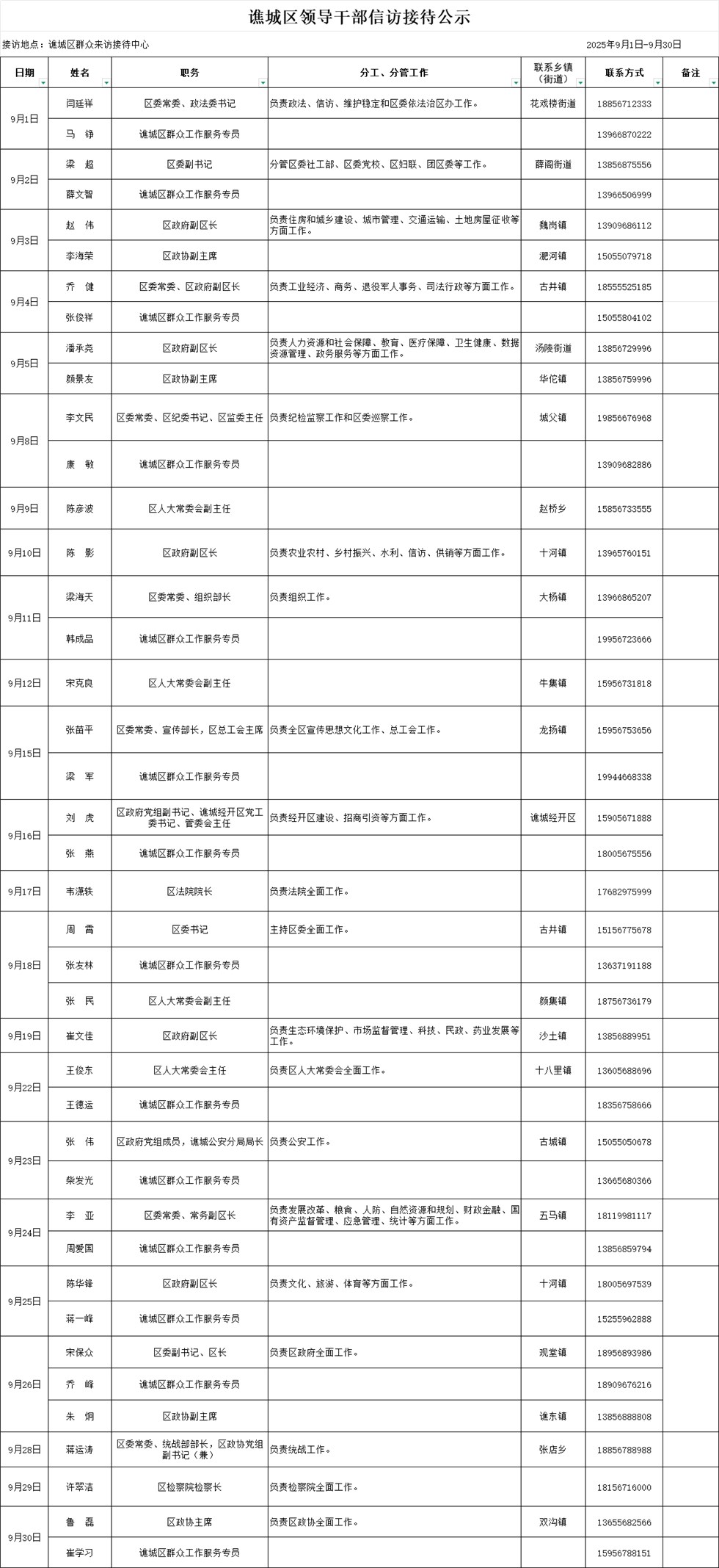 9月份谯城区领导干部信访接待公示
