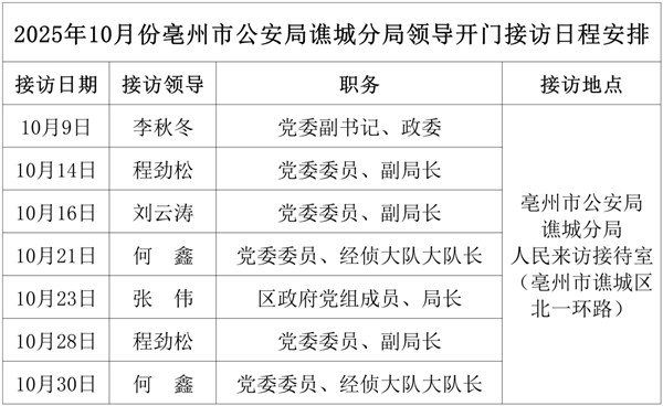 | 名称: | 亳州市公安局谯城分局领导干部公开接访公示 |