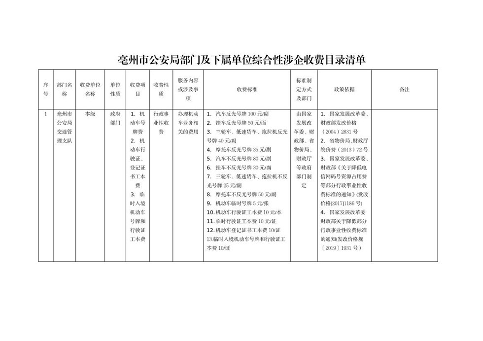 | 名称: | 亳州市公安局部门及下属单位综合性涉企收费目录清单 |