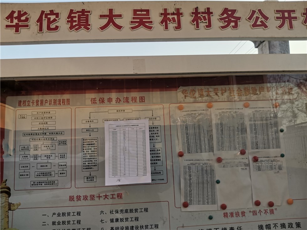 | 名称: | 华佗镇大吴村惠民惠农补贴村务公开栏公示情况 | 文号: | 无 |