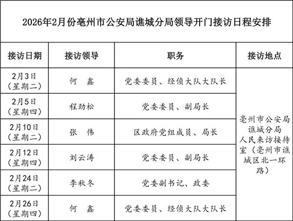 | 名称: | 【领导活动】亳州市公安局谯城分局领导干部公开接访公示 |